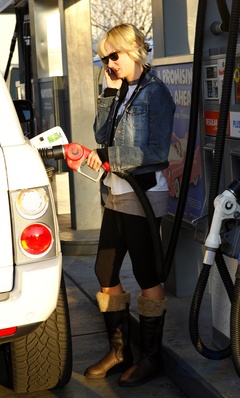 Kimberly Stewart tankuje samochod i rozmawia przez telefon