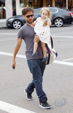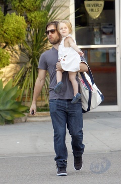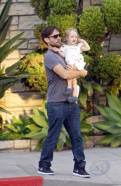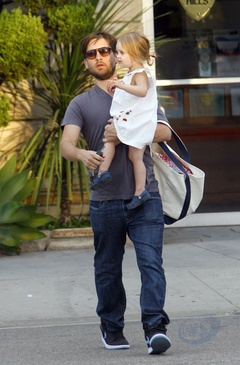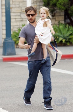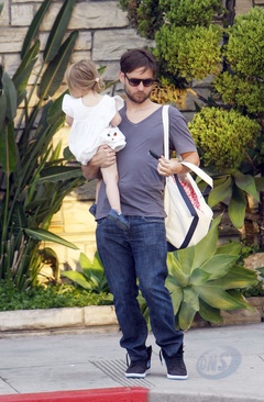 Tobey Maguire z corka Ruby Sweetheart wracaja ze sklepu 'Color Me Mine', Beverly Hills