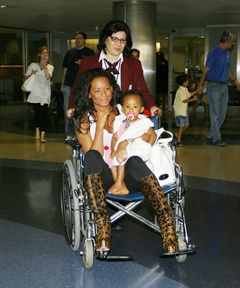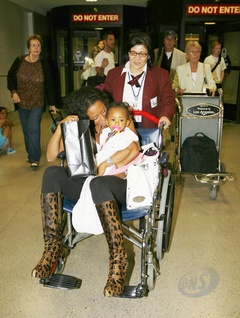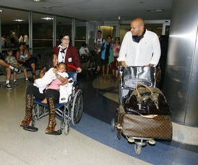 Melanie Brown przybywa na lotnisko na wozku inwalidzkim w Los Angeles