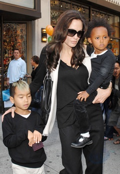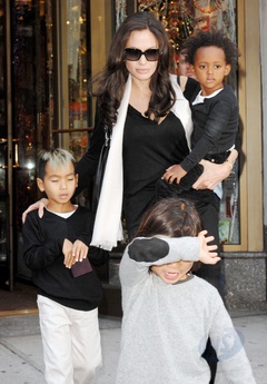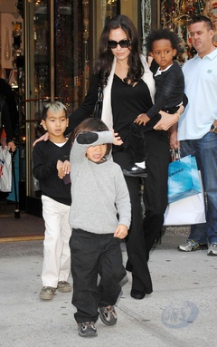 Angelina Jolie z dziecmi wychodzi ze sklepu Lee Art Shop, Nowy Jork