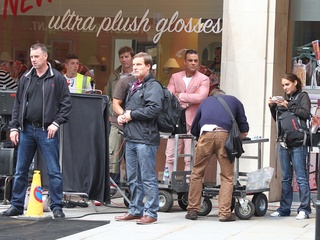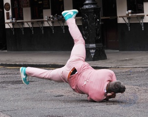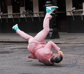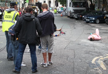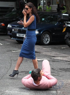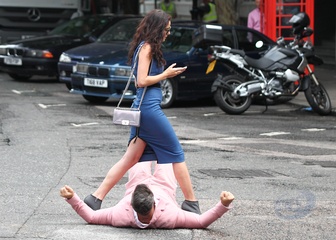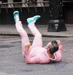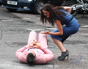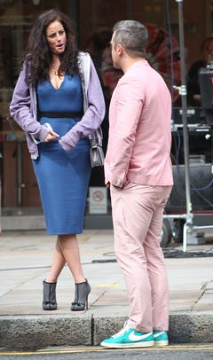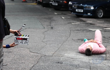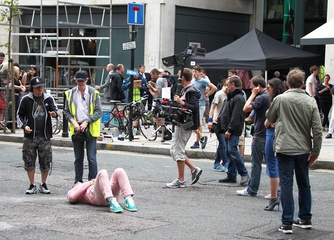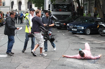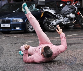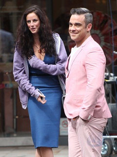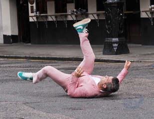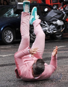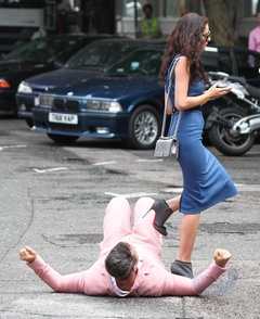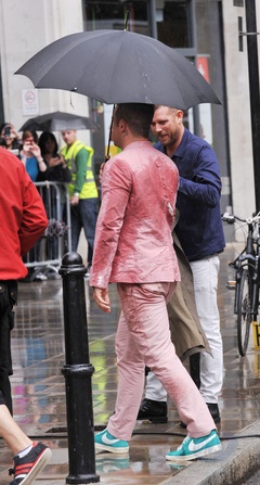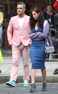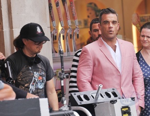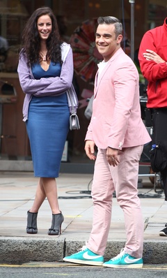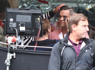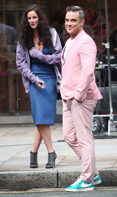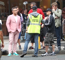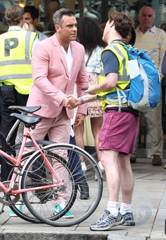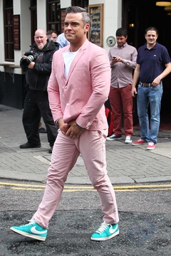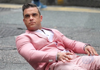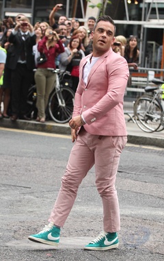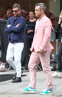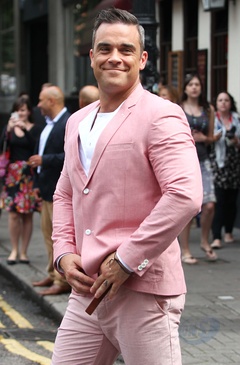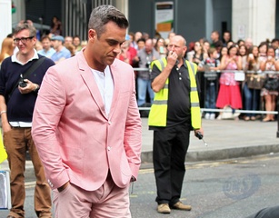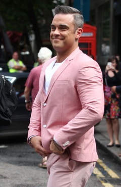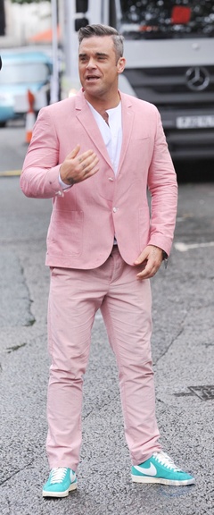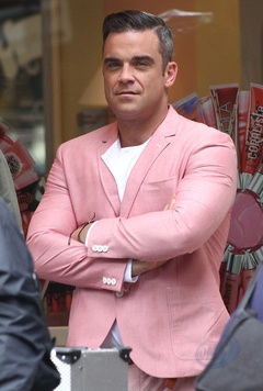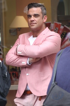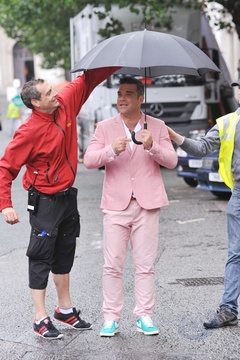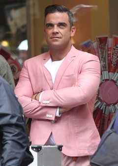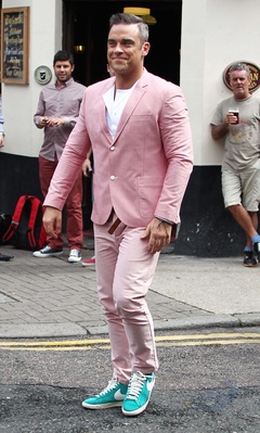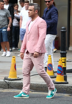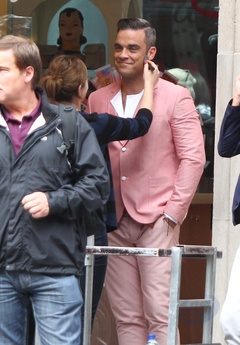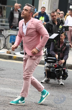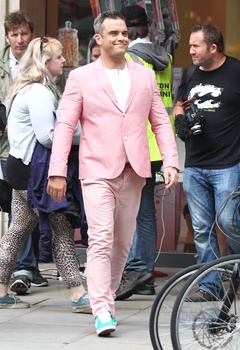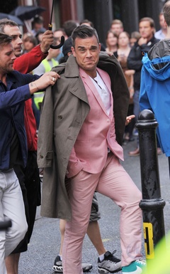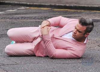Robbie Williams w rozowym garniturze na planie teledysku, Londyn