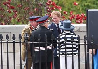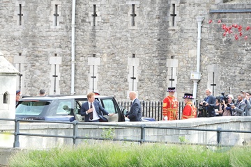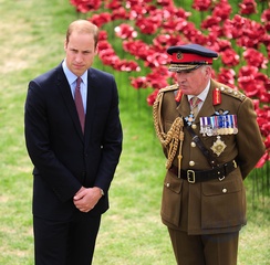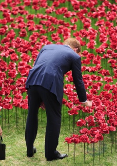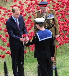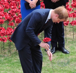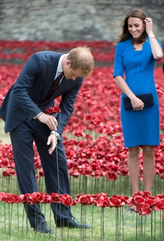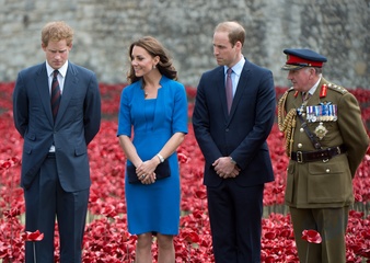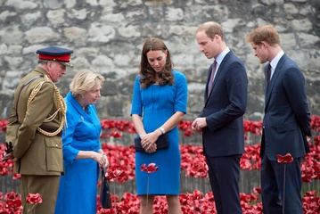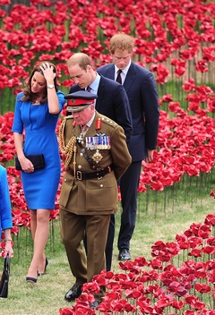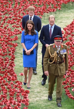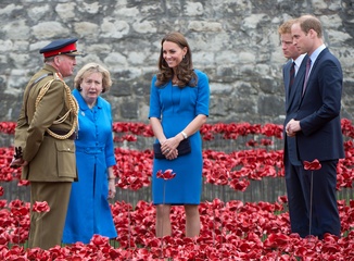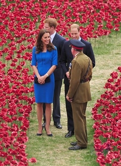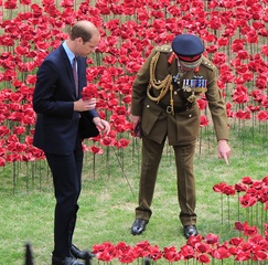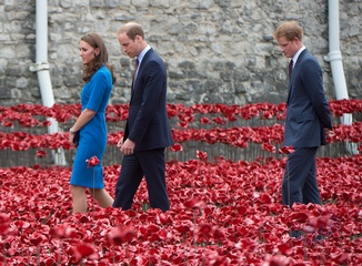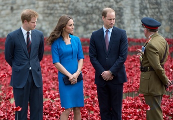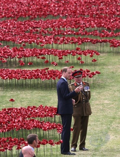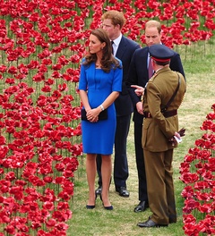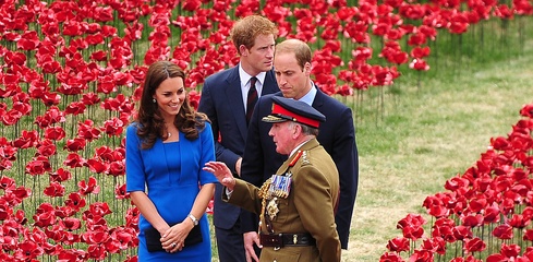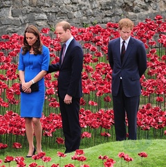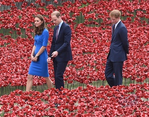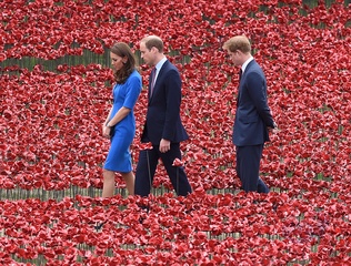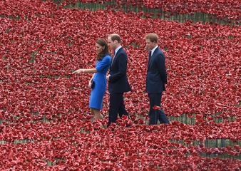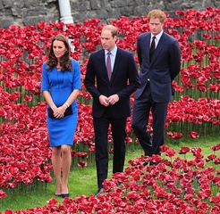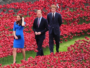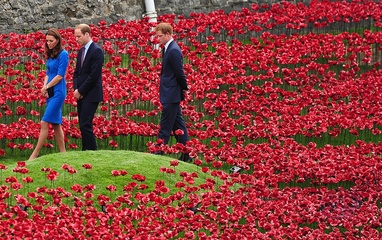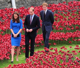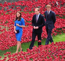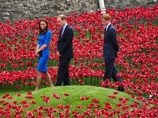 Ksiezna Kate, ksiaze William i ksiaze Harry wsrod ceramicznych makow przy zamku Tower