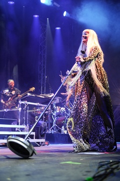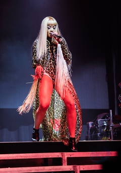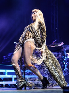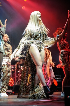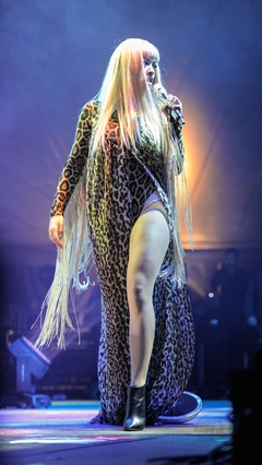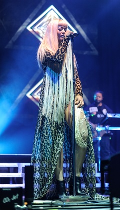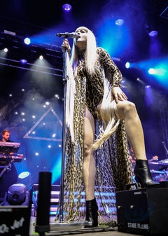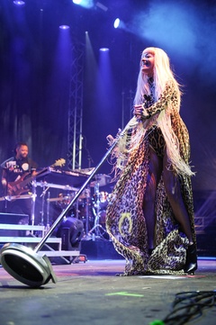 Drapiezna Rita Ora w peruce na scenie w Stafford