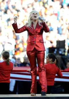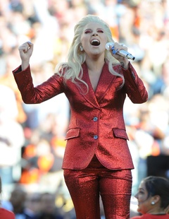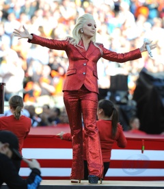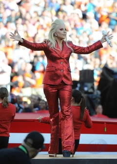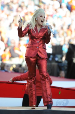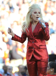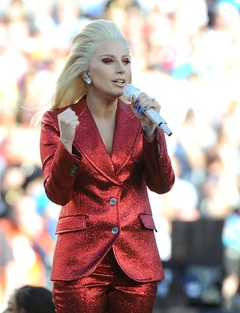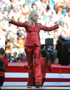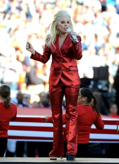 Lady Gaga w czerwonym, blyszczacym garniturze na Super Bowl