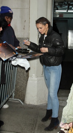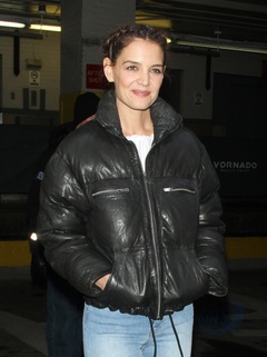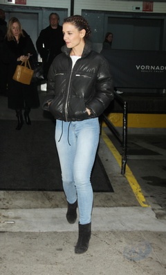Katie Holmes w czarnej, puchowej kurtce i jeansach