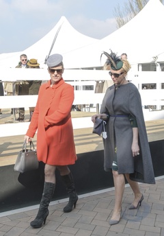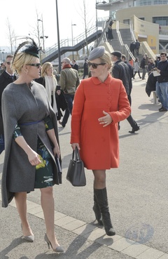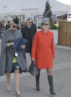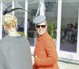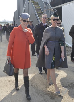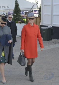 Zara Tindall (Phillips) w pomaranczowym plaszczyku na Cheltenham Racecourse
