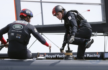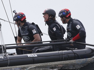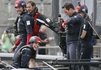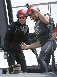Ksiezna Kate z zaloga Land Rover BAR na ich lodzi szkoleniowej w Portsmouth