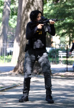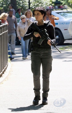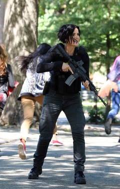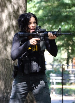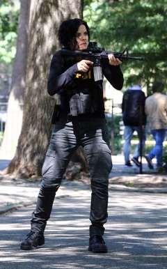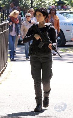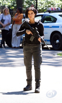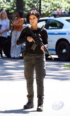Jaimie Alexander z karabinem na planie zdjeciowym