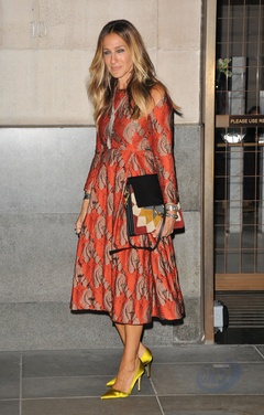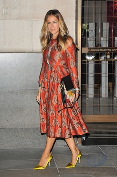 Sarah Jessica Parker w zoltych szpilkach i pomaranczowej sukni