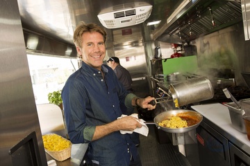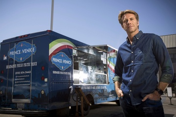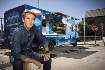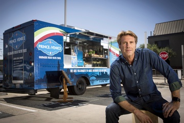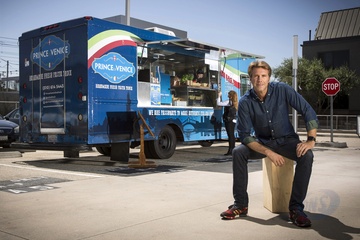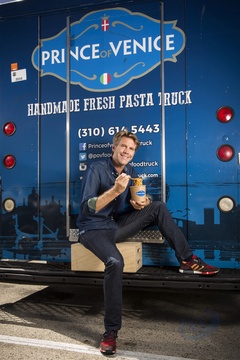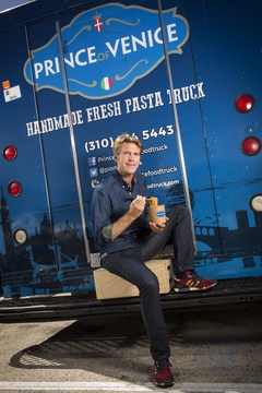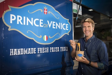 Emanuel Filibert, ksiaze Wenecji i Piemontu sprzedaje z auta dania z makaronu