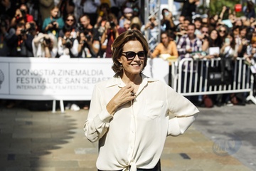 Sigourney Weaver w koszuli, spodniach i trampkach w San Sebastian