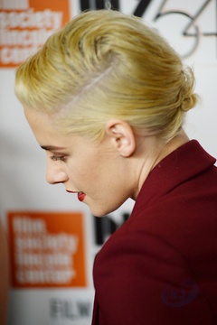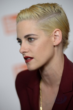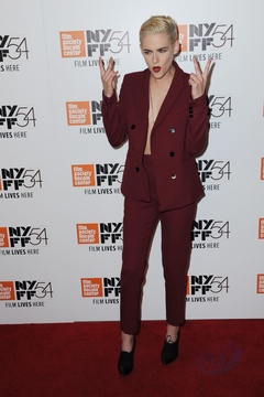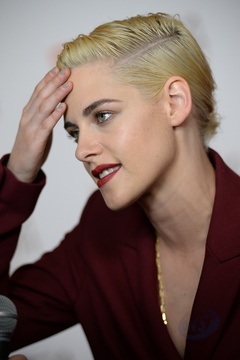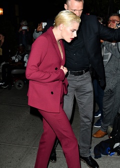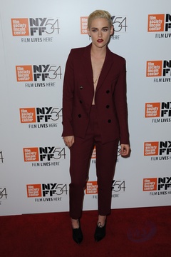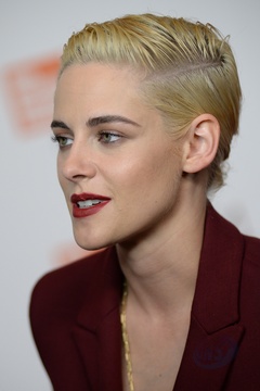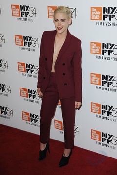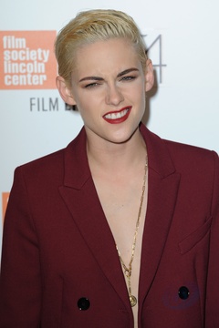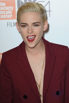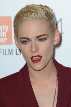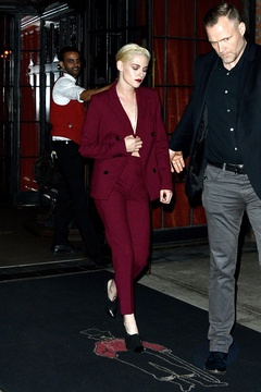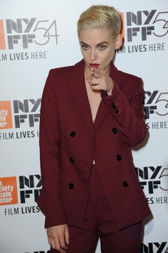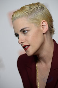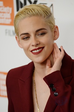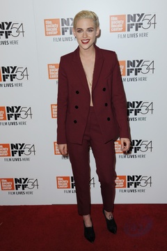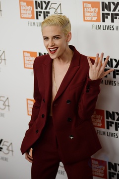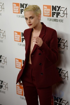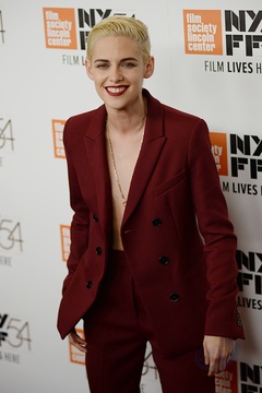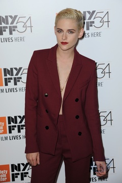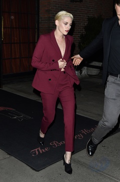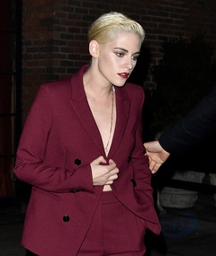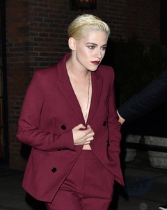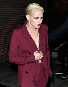 Kristen Stewart w bordowym garniturze, bez bluzki