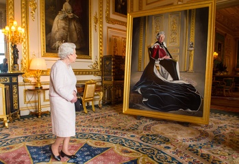 Krolowa Elzbieta II oglada swoj ogromny obraz