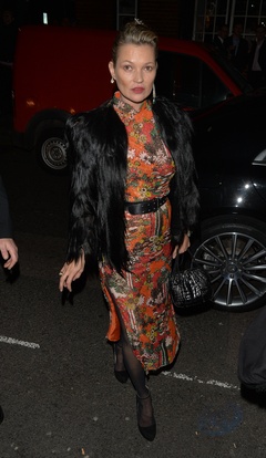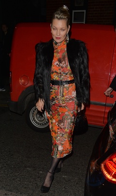 Kate Moss w czarnym futerku i wzorzystej sukience