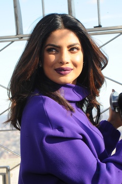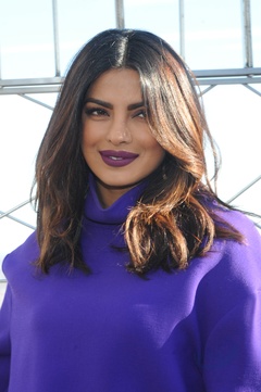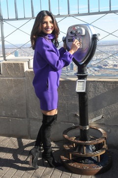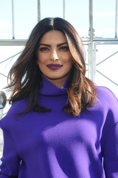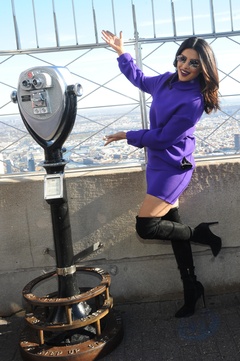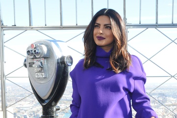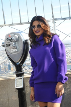 Priyanka Chopra w fioletowej, luznej sukience na Empire State Building