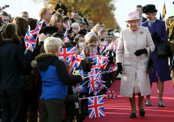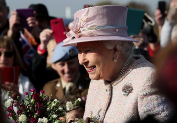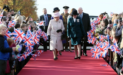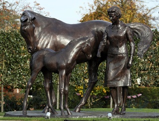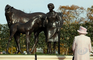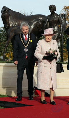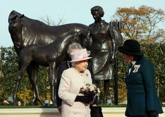 Krolowa Elzbieta II przy swoim pomniku z konmi
