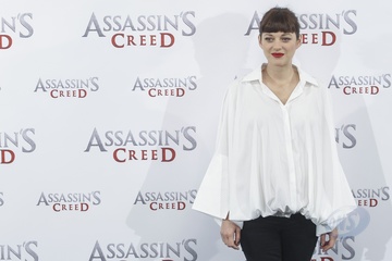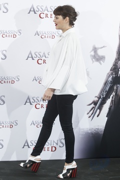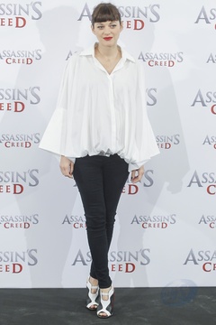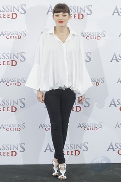 Marion Cotillard w bialej koszuli na photocall Assassins Creed, Madryt