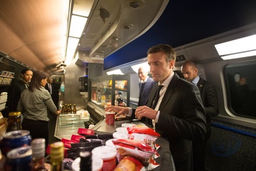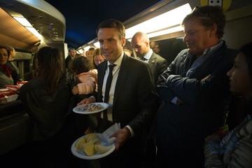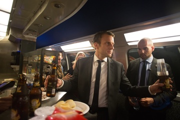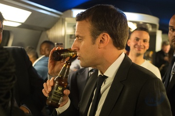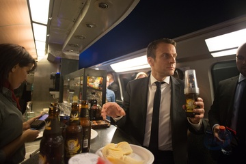 Emmanuel Macron pije piwko i je orzeszki w pociagu TGV