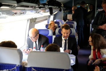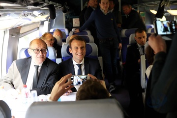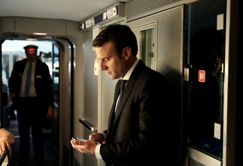Emmanuel Macron w pociagu, w drodze na spotkanie w Nantes