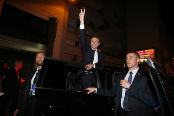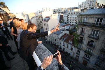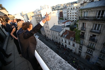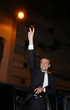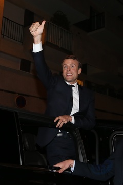 Szczesliwy Emmanuel Macron pozdrawia Francuzow
