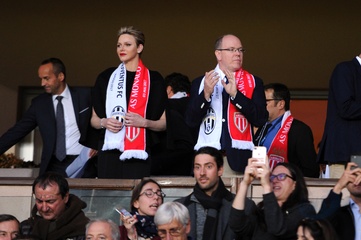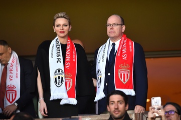 Ksiaze Albert II z zona Charlene na trybunach podczas meczu Monaco - Juventus Turyn