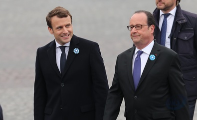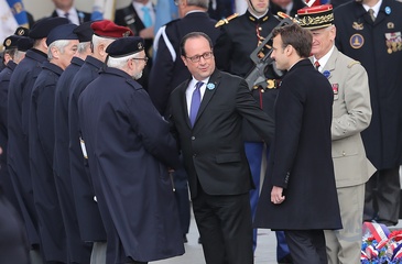 Francois Hollande i Emmanuel Macron podczas obchodow 72. rocznicy zakonczenia II wojny swiatowej