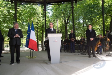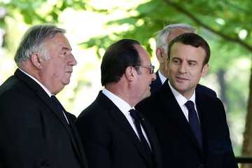 Francois Hollande i Emmanuel Macron podczas uroczystosci rocznicy zniesienia niewolnictwa