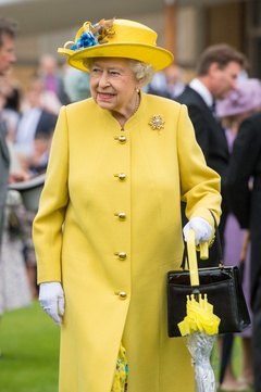 Krolowa Elzbieta II w zoltym plaszczyku i zoltym kapeluszu na garden party w Palacu Buckingham