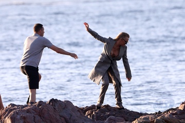 Pamela Anderson traci rownowage, sesja zdjeciowa na plazy