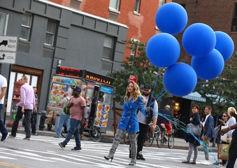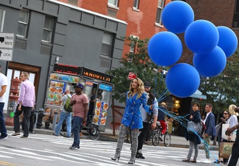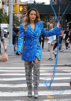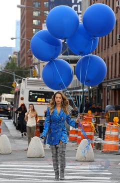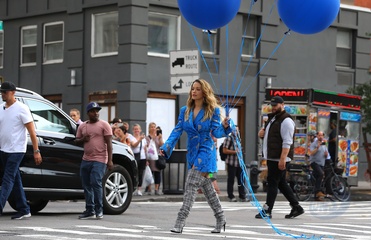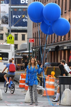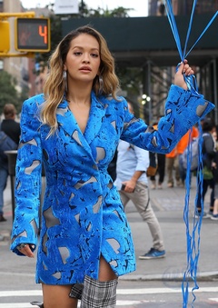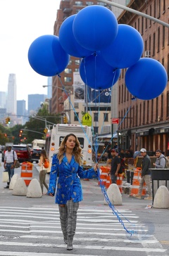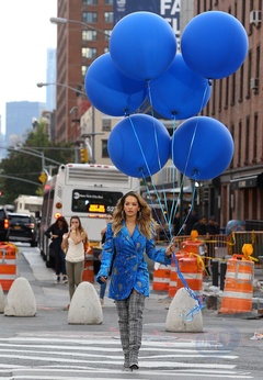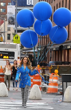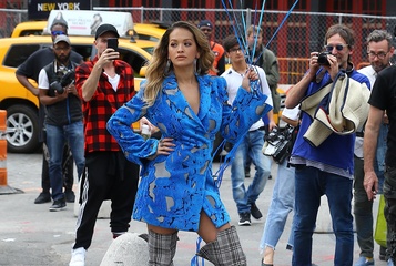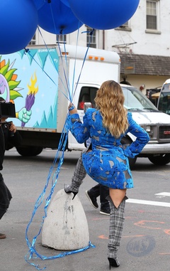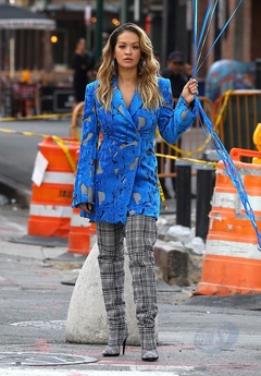 Rita Ora z niebieskimi balonami na planie teledysku