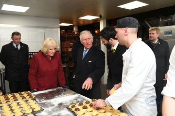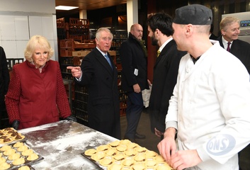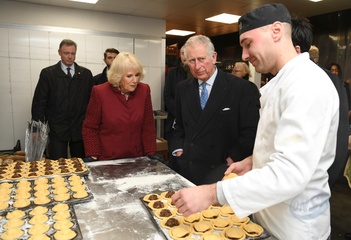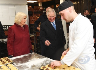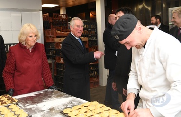 Ksiezna Camilla i ksiaze Karol przy produkcji ciasteczek