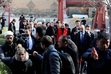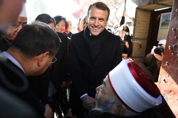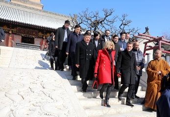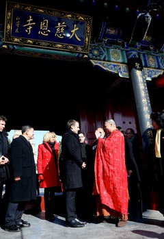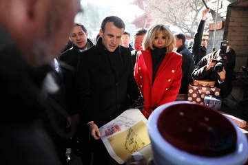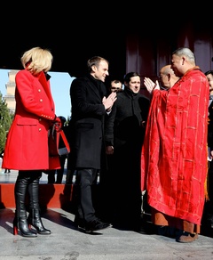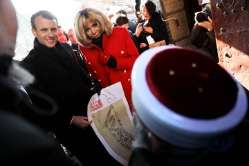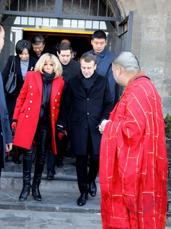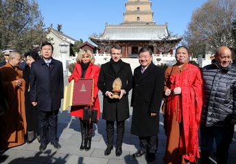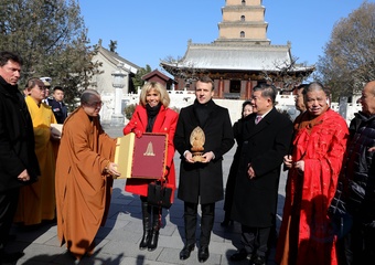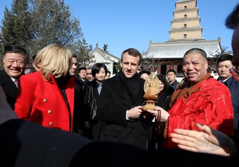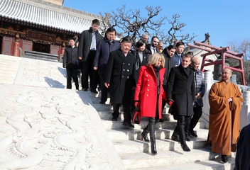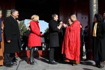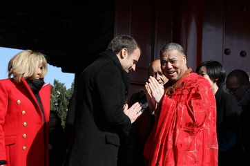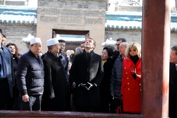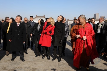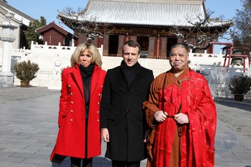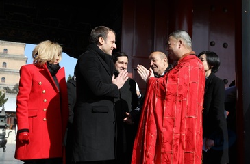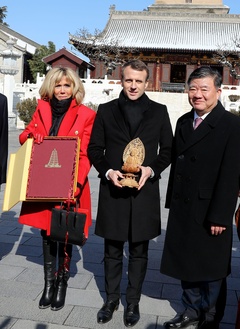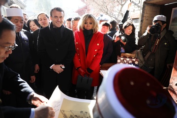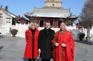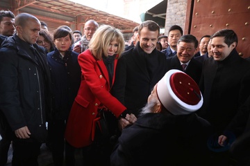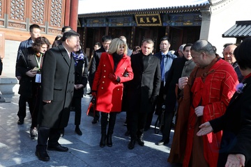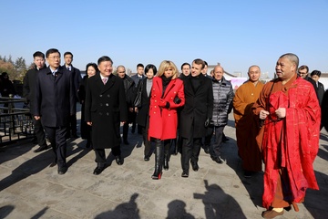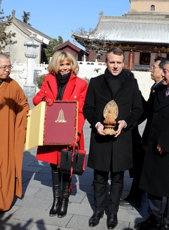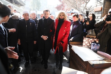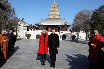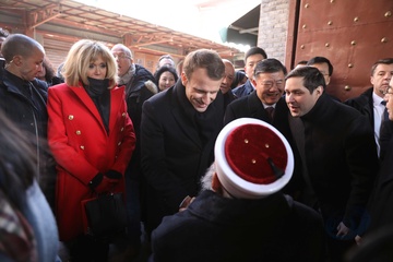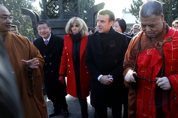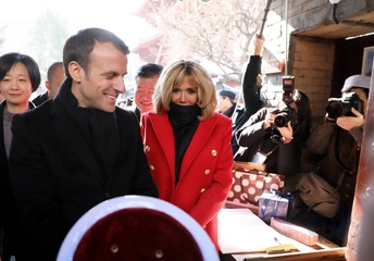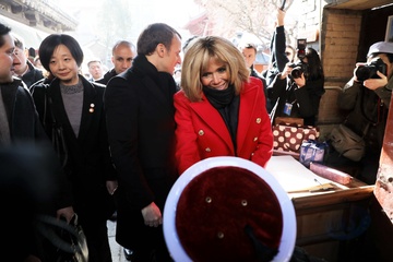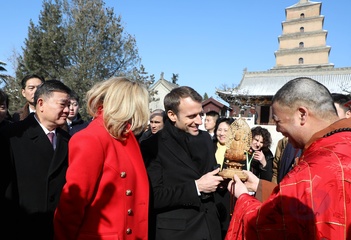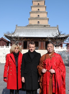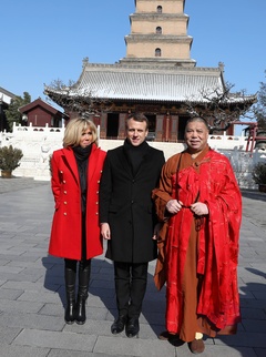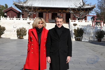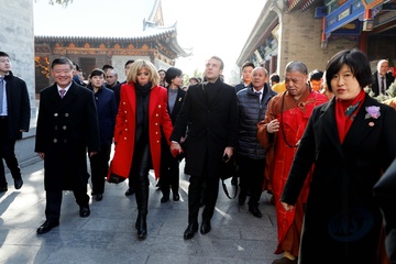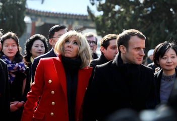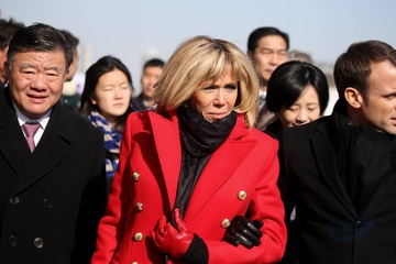 Brigitte Macron w czerwonym plaszczyku i Emmanuel Macron podczas wizyty w Chinach 77