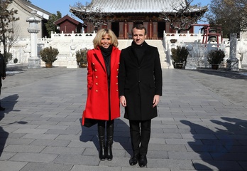 Brigitte Macron w czerwonym plaszczyku i Emmanuel Macron podczas wizyty w Chinach