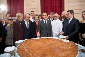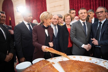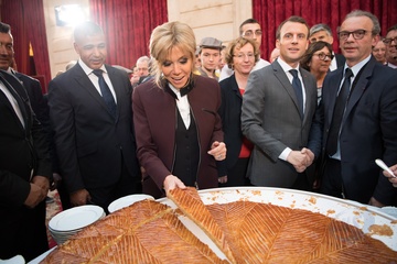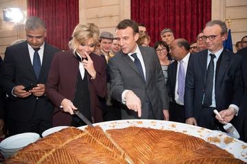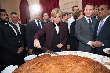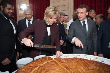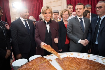 Brigitte Macron i Emmanuel Macron kroja tradycyjne ciasto podczas uroczystosci w Palacu Elizejskim