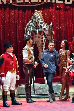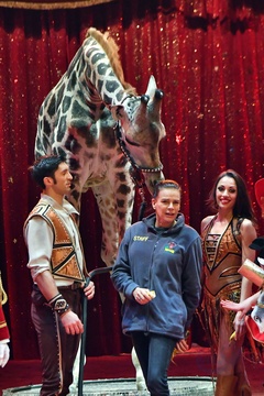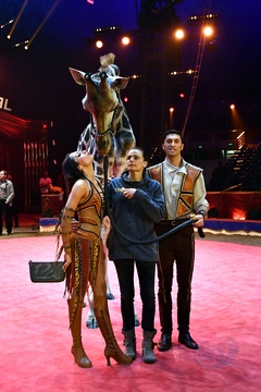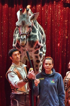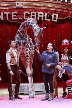 Ksiezniczka Stefania karmi zyrafe na 42. Monte-Carlo International Circus Festival