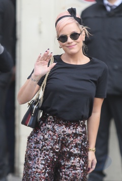 Lily Allen w cekinowych, szerokich spodniach przed pokazem Chanel
