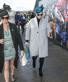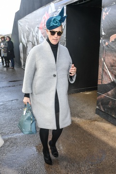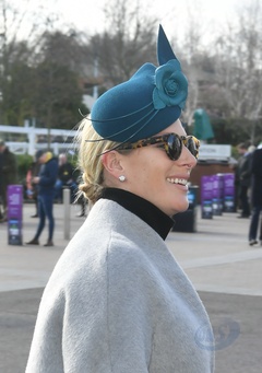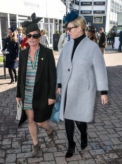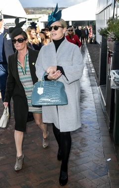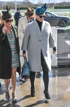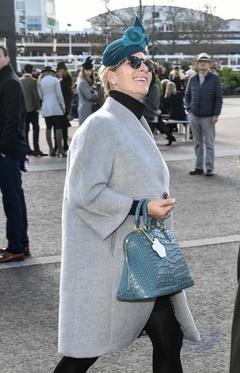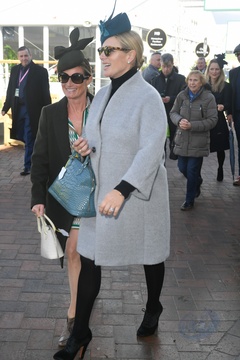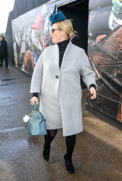 Zara Tindall w szarym plaszczyku na Cheltenham Racecourse