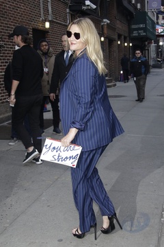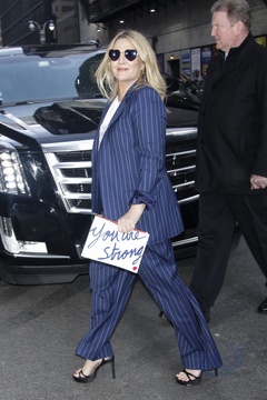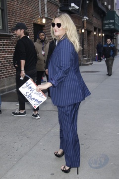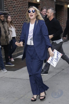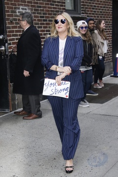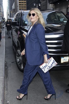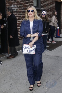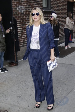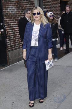 Drew Barrymore w garniturze w prazki i z torebka - You are strong
