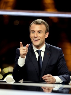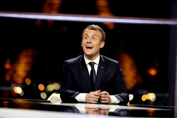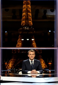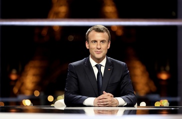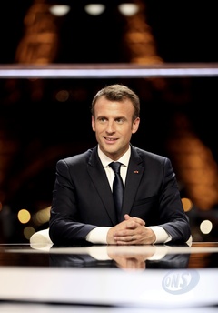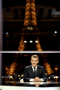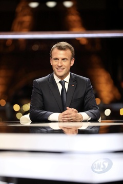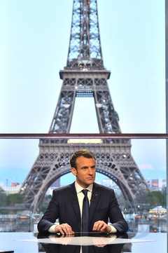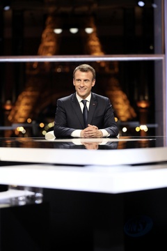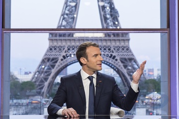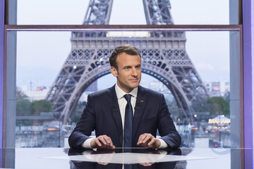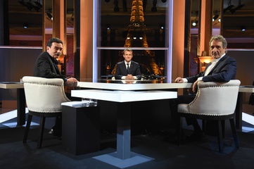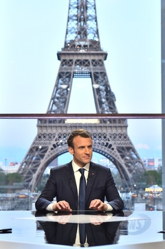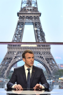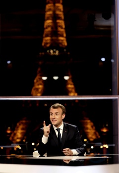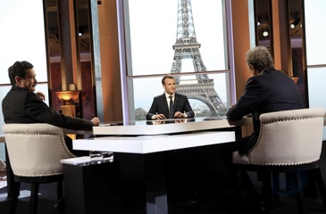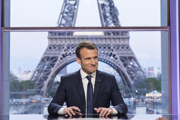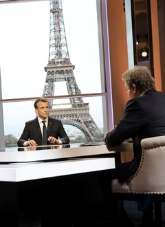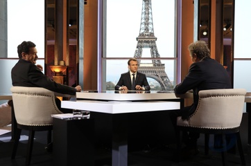 Emmanuel Macron udziela wywiadu na tle Wiezy Eiffla