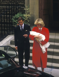 Wspomnienie - Diana w czerwonej sukience jak Kate - wychodzi ze szpitala z Harrym