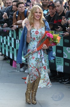 Kylie Minogue w kwiecistej sukience i w zlotych kozaczkach