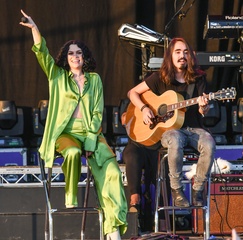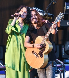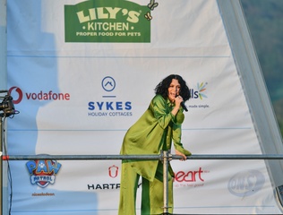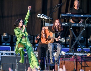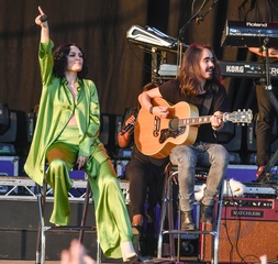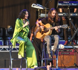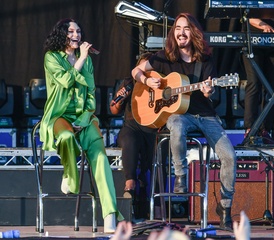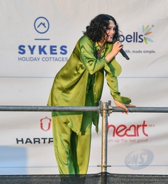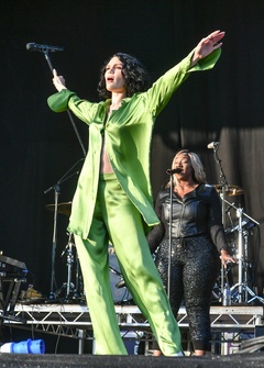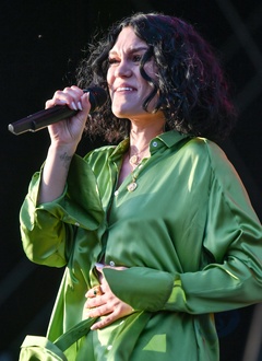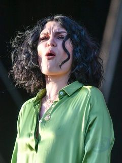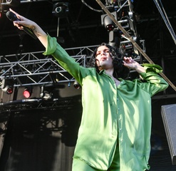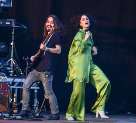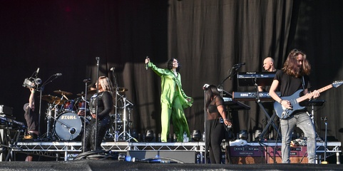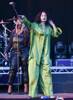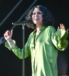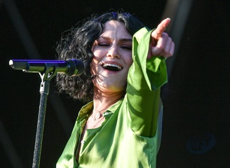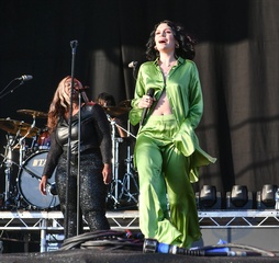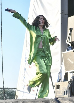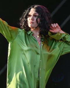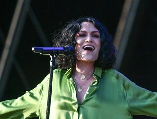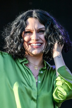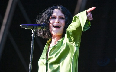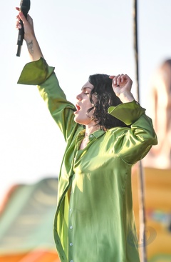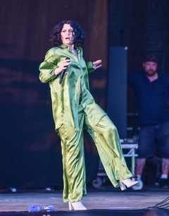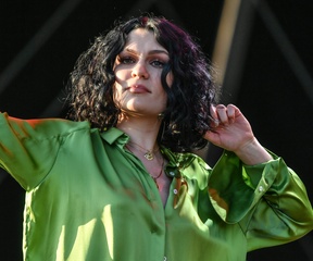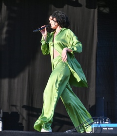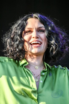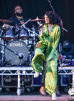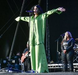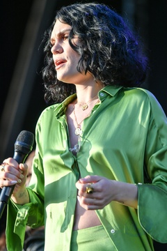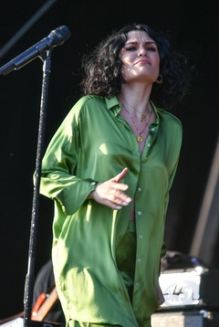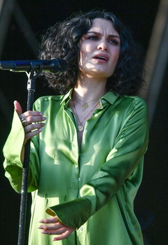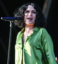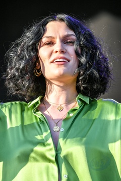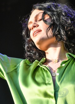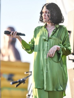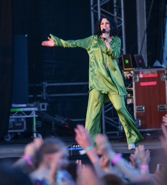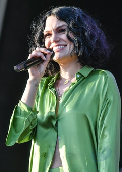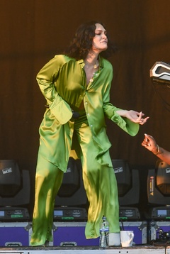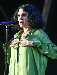 Jessie J w zielonej pizamie i w masce kota na scenie