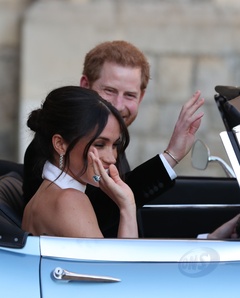 Ksiaze Harry i Meghan Markle - juz przebrani w drodze na przyjecie weselne