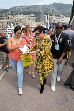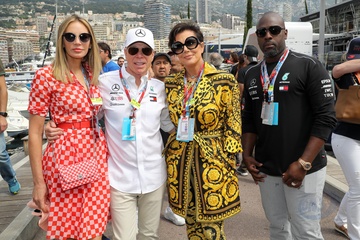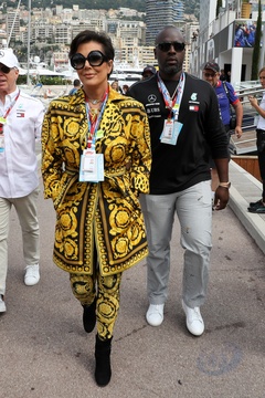 Kris Jenner we wzorzystym, zoltym kostiumie na Grand Prix of Monaco