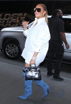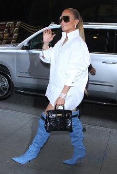 Jennifer Lopez w bialej koszuli i jeansowych kozakach