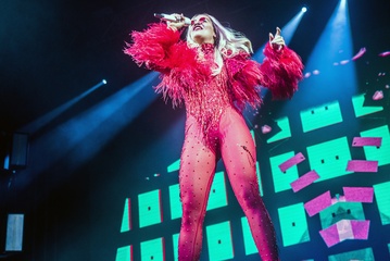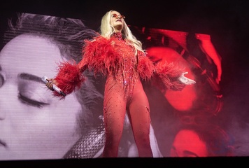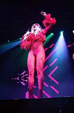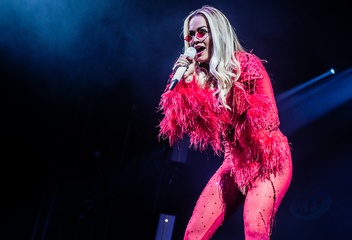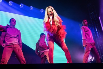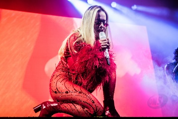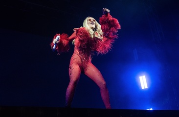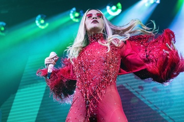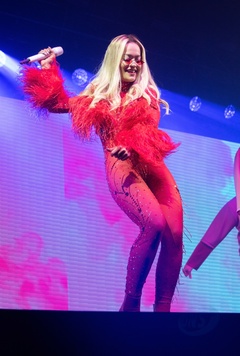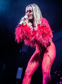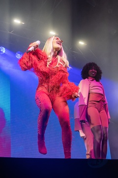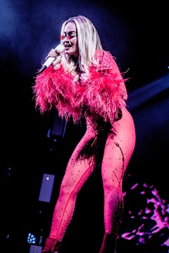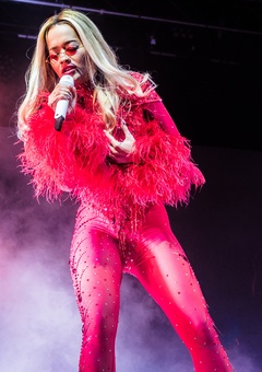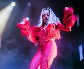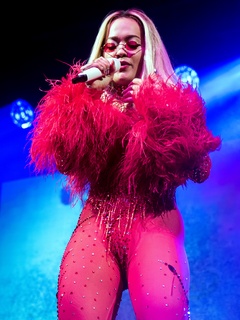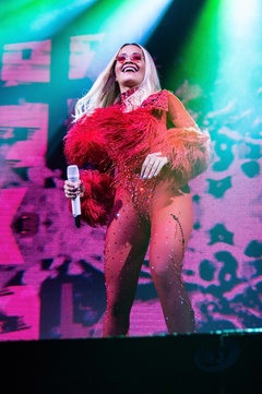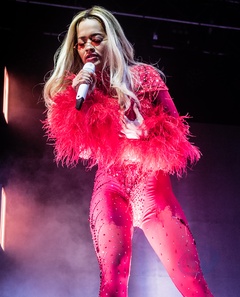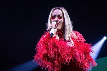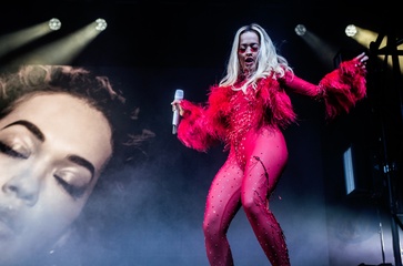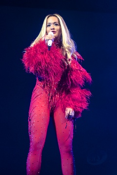 Rita Ora na scenie w czerwonym kombinezonie z pierzastymi rekawami