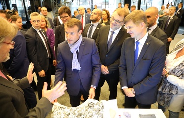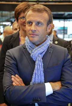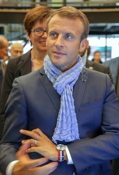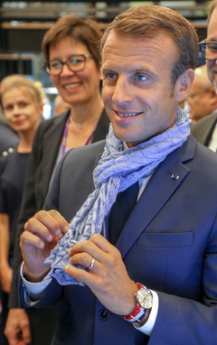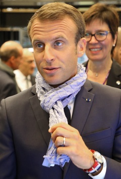 Emmanuel Macron w blekitnym szaliczku z inteligentnych materialow