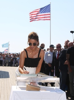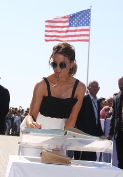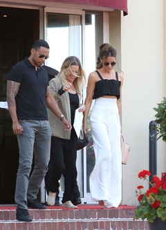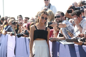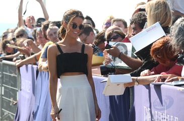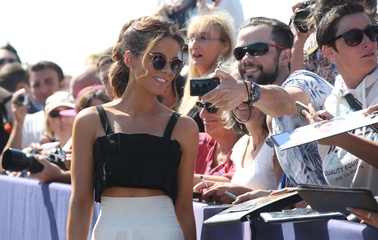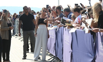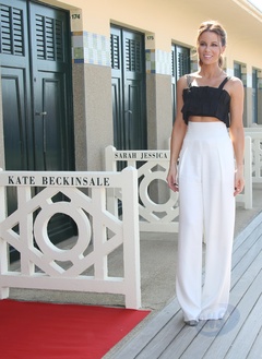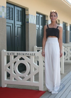 Kate Beckinsale w bialych spodniach i czarnym topie na Festiwalu w Deauville