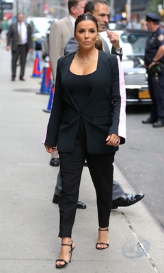 Eva Longoria w czarnej marynarce i czarnych spodniach w drodze do tv