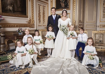 Ksiezniczka Eugenia, Jack Brooksbank, Thomas Brooksbank; Nicola Brooksbank; George Brooksbank; Ksiezniczka Beatrice, Sarah Ferguson, ksiezna Yorku; Ksiaze Andrzej, ksiaze Jerzy, Ksiezniczka Charlotte, krolowa Elzbieta, ksiaze Filip, Miss Maud Windsor, Mi